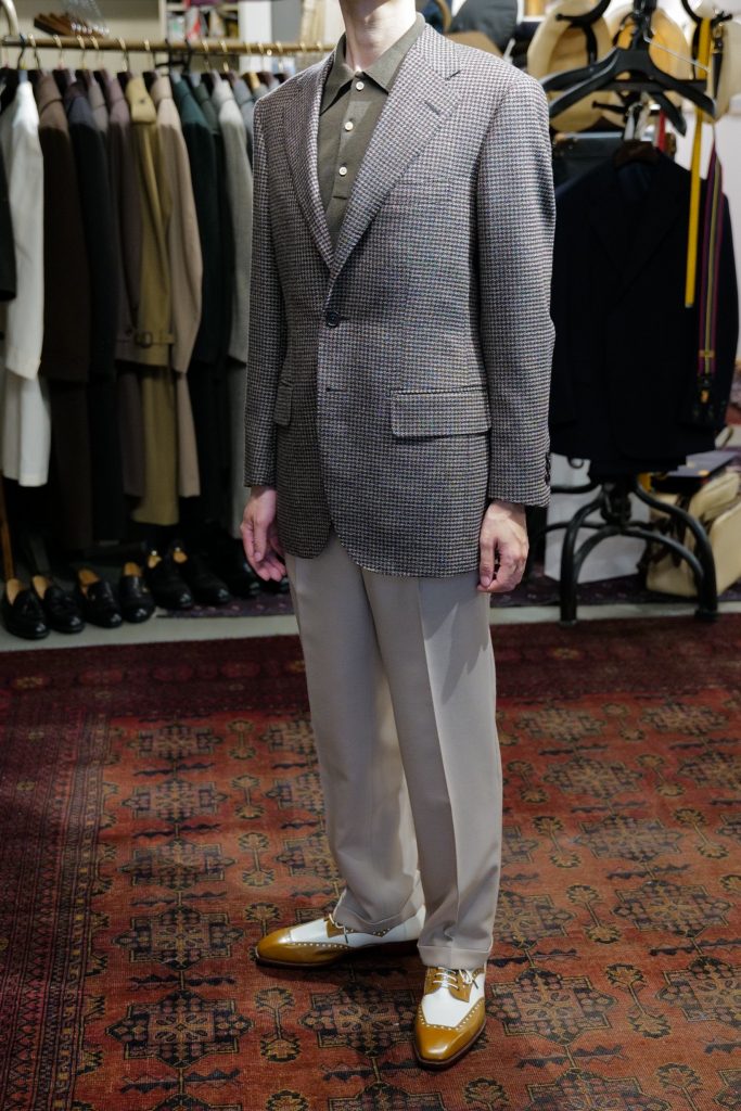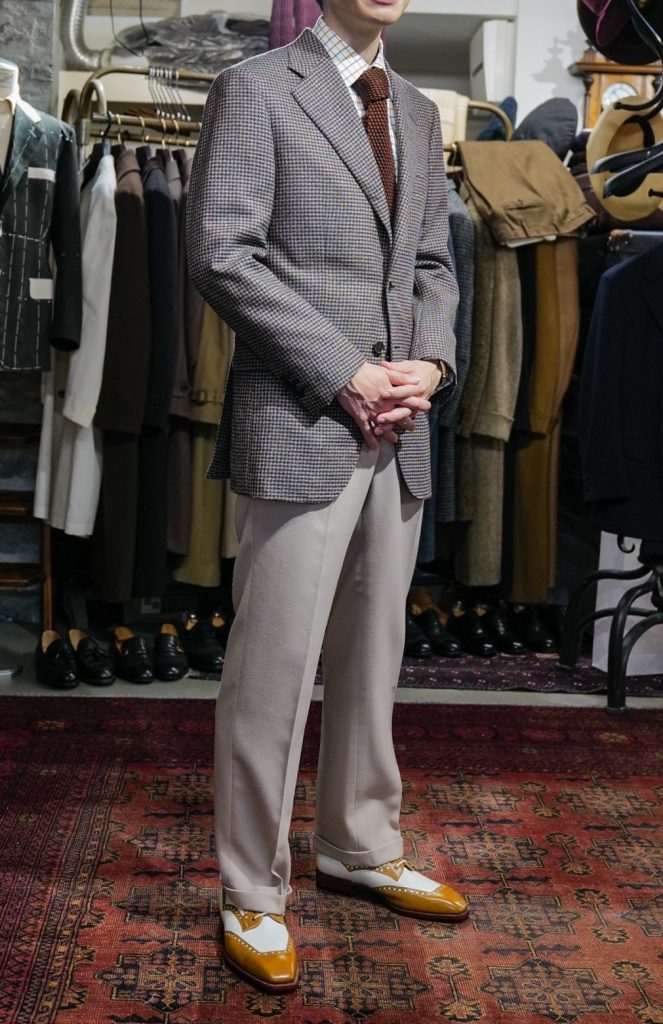 少しカジュアルさがあるブラウンの千鳥格子に、上品なオフホワイトのトラウザーズ。そこに合わせるのは今回のテーマであるコンビシューズ。