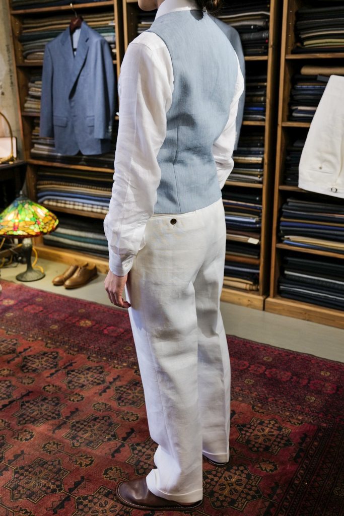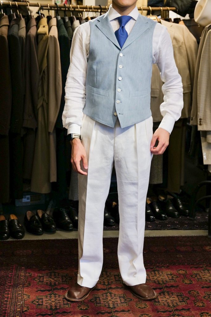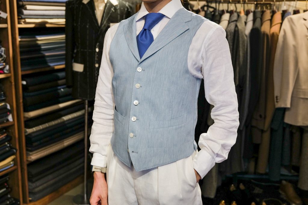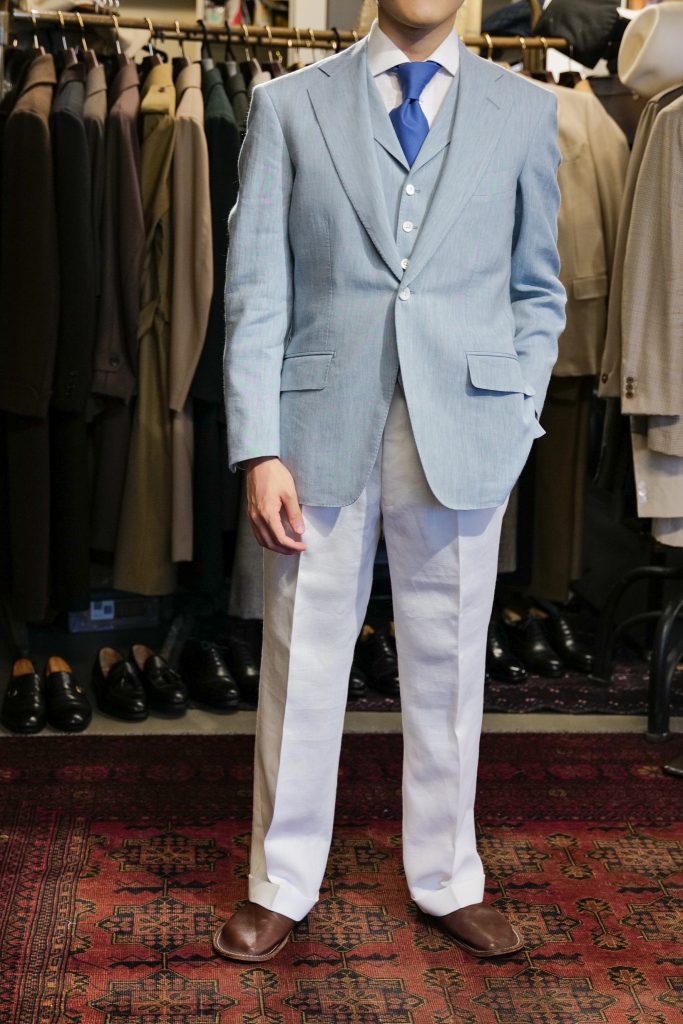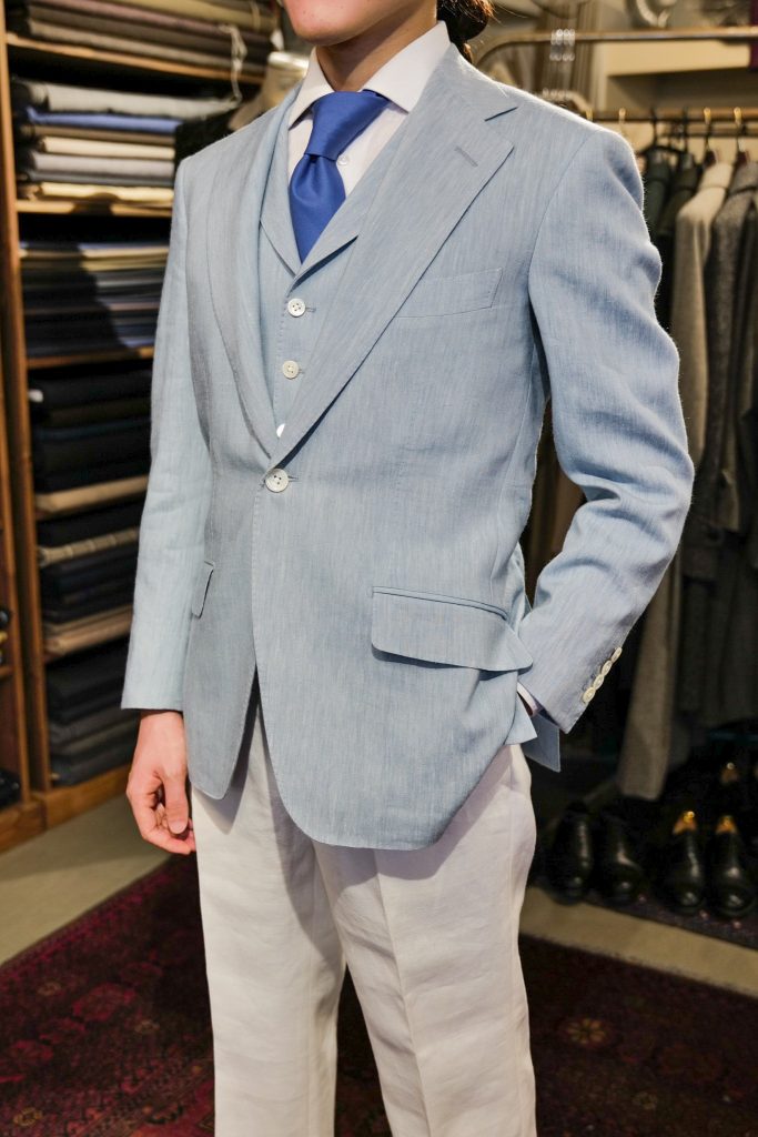 お作りしたのは、私も持っている、そしてBERUNでもネクタイを作っている、水色のモヘアリネンのジャケット&ベスト。