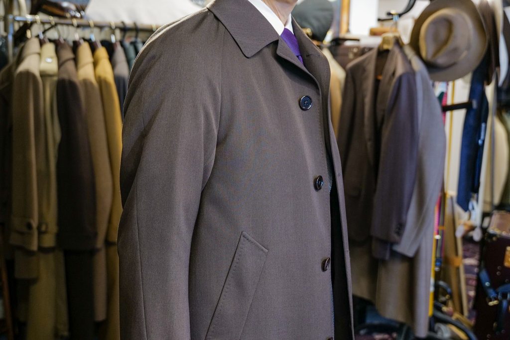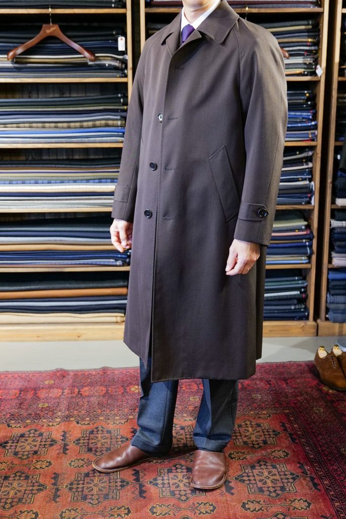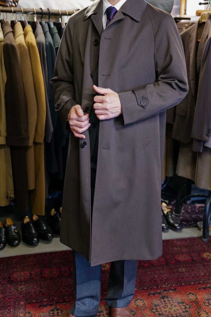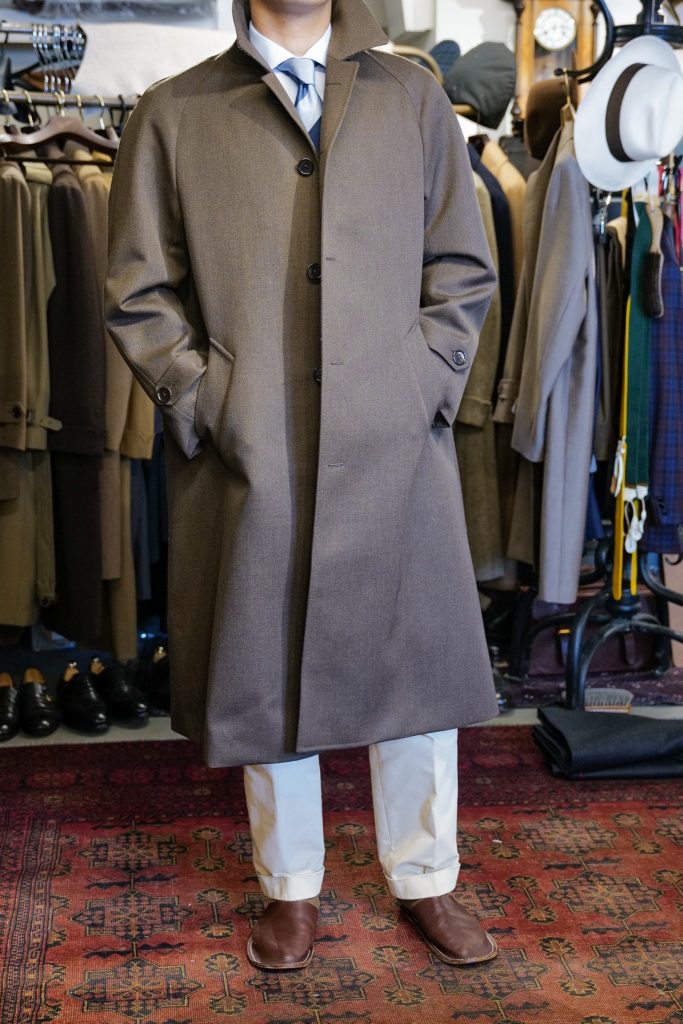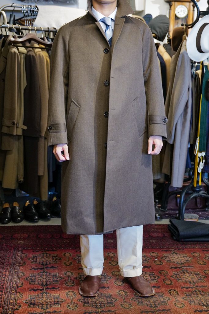 たまたまブラウンのバルマカーンコートが並びましたが、全く異なる質感ですので、その生地の厚みと表情の違いでどのように見え方が変わるかを、感じていただけたら幸いです。