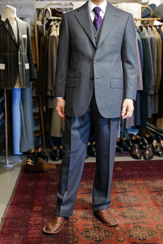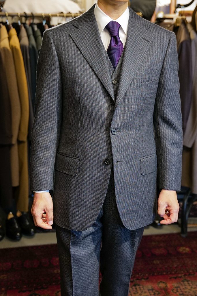 グレーのバーズアイ。重さも450gmsとしっかりと肉感のあるスーツ生地。
