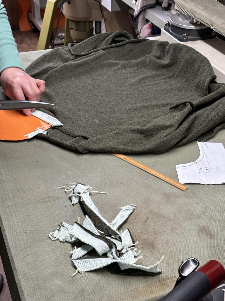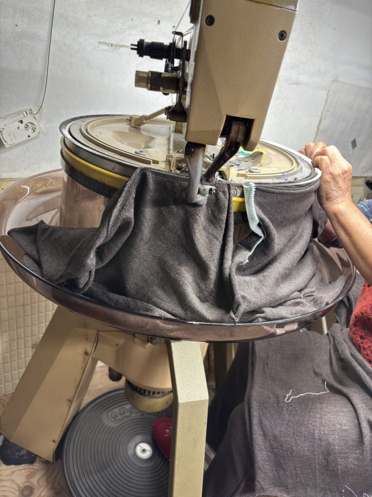 身頃と首を合わせる作業をしています。リンキングミシンと呼ばれるものでひと針ずつ縫い合わせています。骨が折れる作業です。