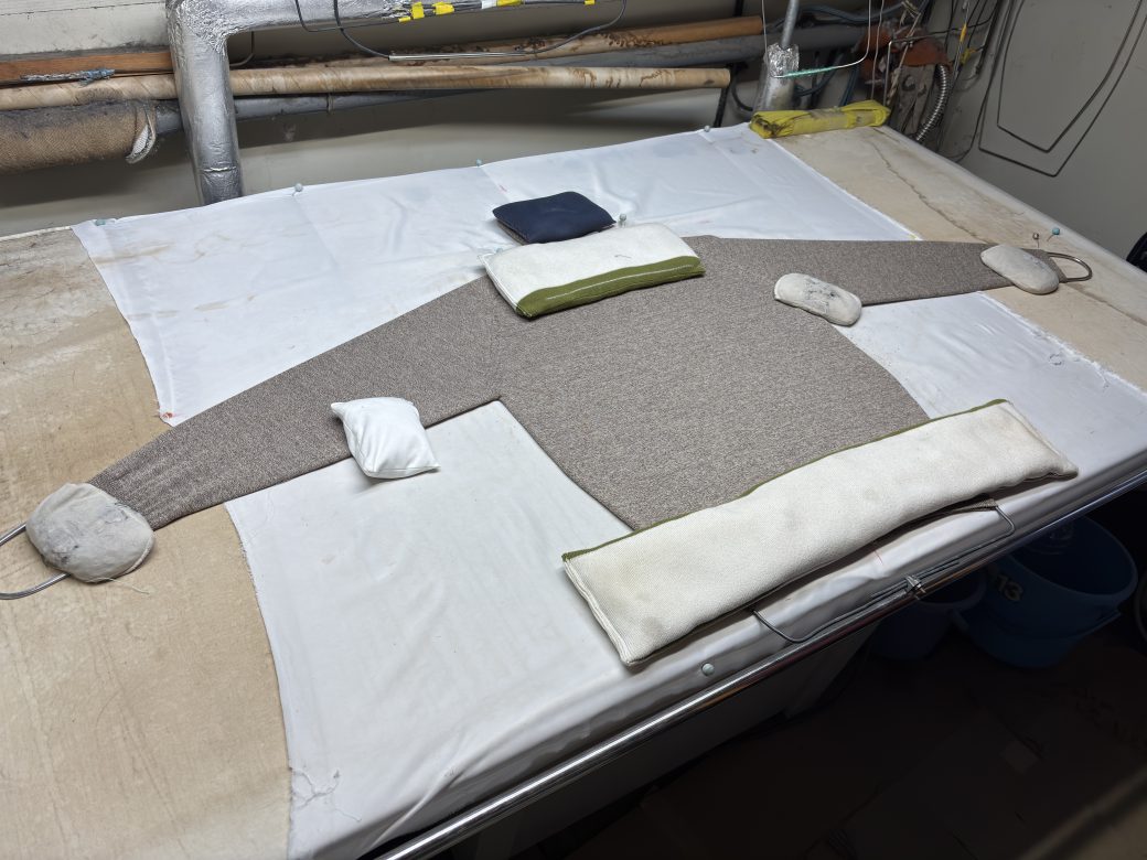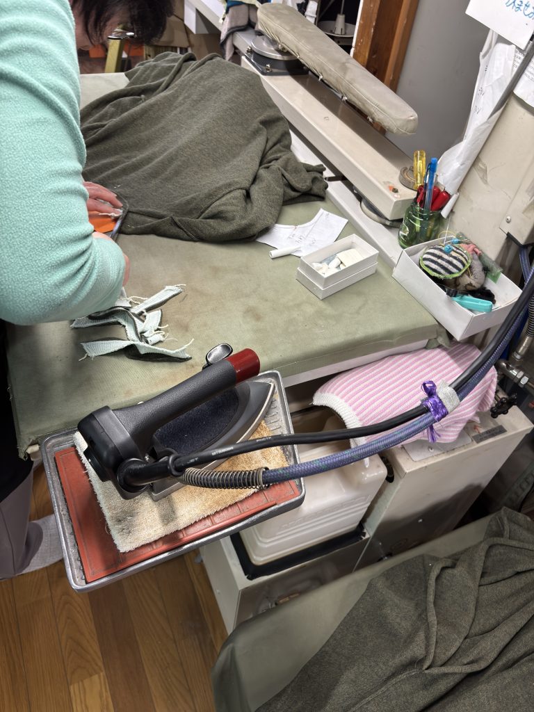 アイロンを当てると伸びるため、仕上げにはひとつひとつこのように重しを置いて、下から蒸気を当てるという作業を行なっています。