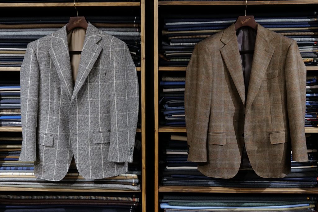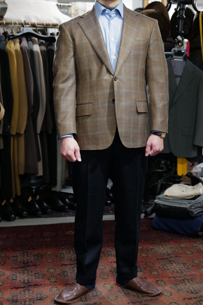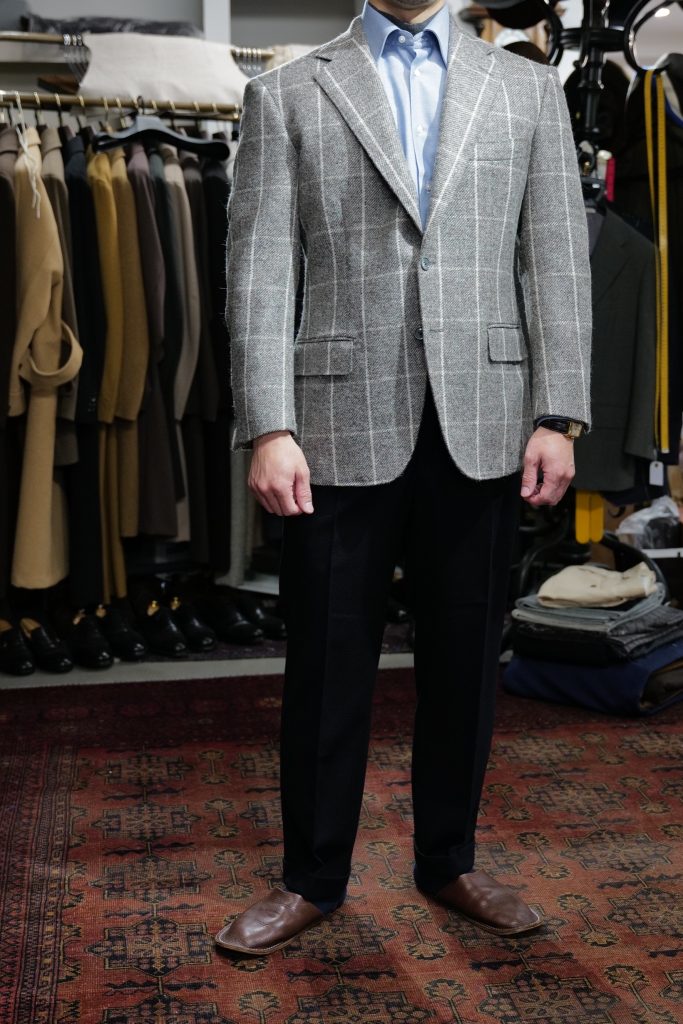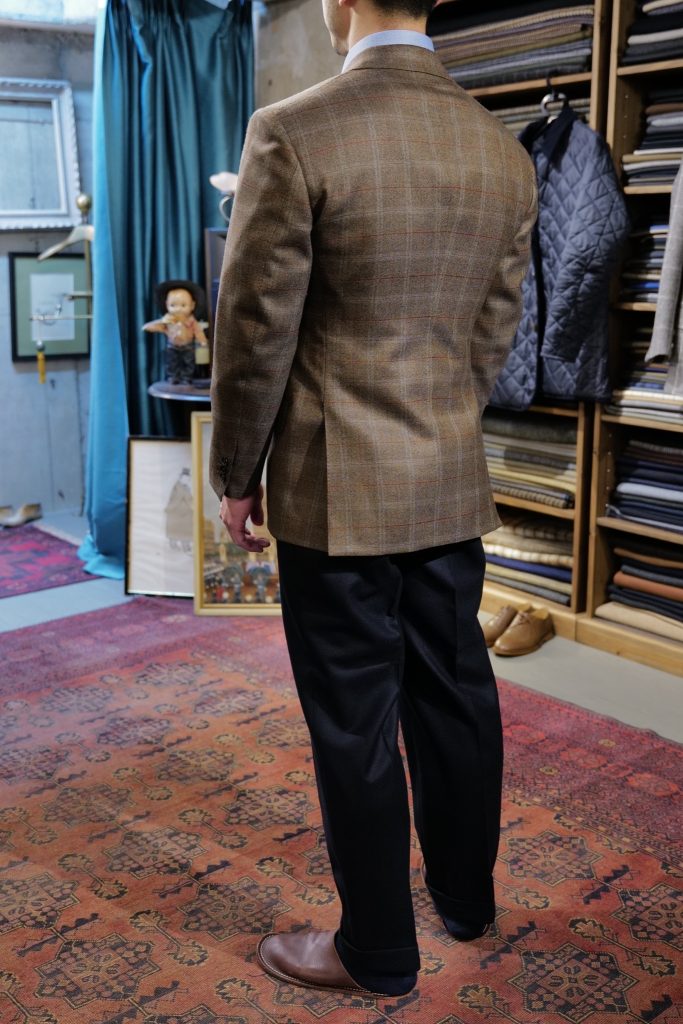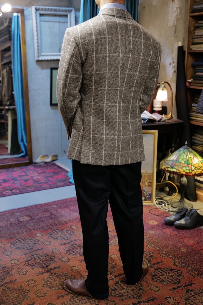 ​今回もう一着お作りしましたが、こちらはマーリング&エヴァンスのアンダイドのツイードジャケットです。こちらも大判のウィンドウペーンですので一見派手ですが、着てみると「全然いけるじゃないか」となります。