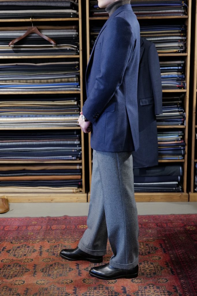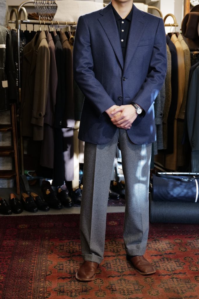 ​今回M様にお作りしたのは、ネイビーブルーのフランネルトラウザーズ。当日は以前ベルンでお作りしたダークネイビーの長袖ニットポロを着てきてくださいました。ジャケットスタイルにニットポロは非常に相性が良いです。