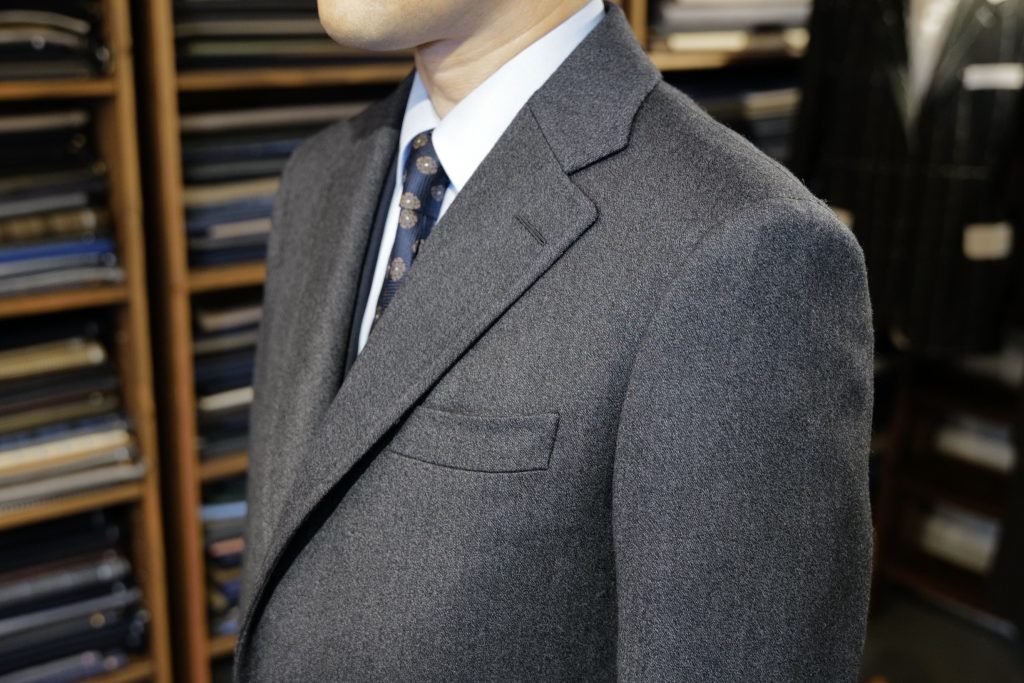 ​選んだ生地は、20年ほど前のセミヴィンテージとなるゼニアのウールカシミヤ。グレーのヘリンボーンでシックな見た目ですが、とろけるような柔らかさのある素晴らしい質感です。