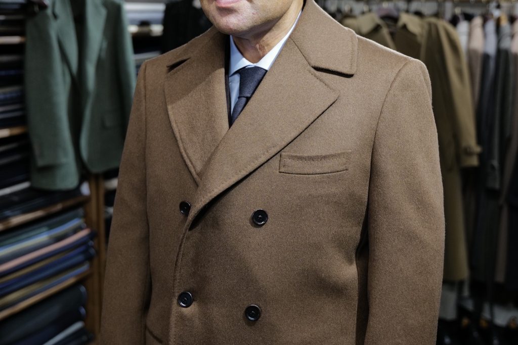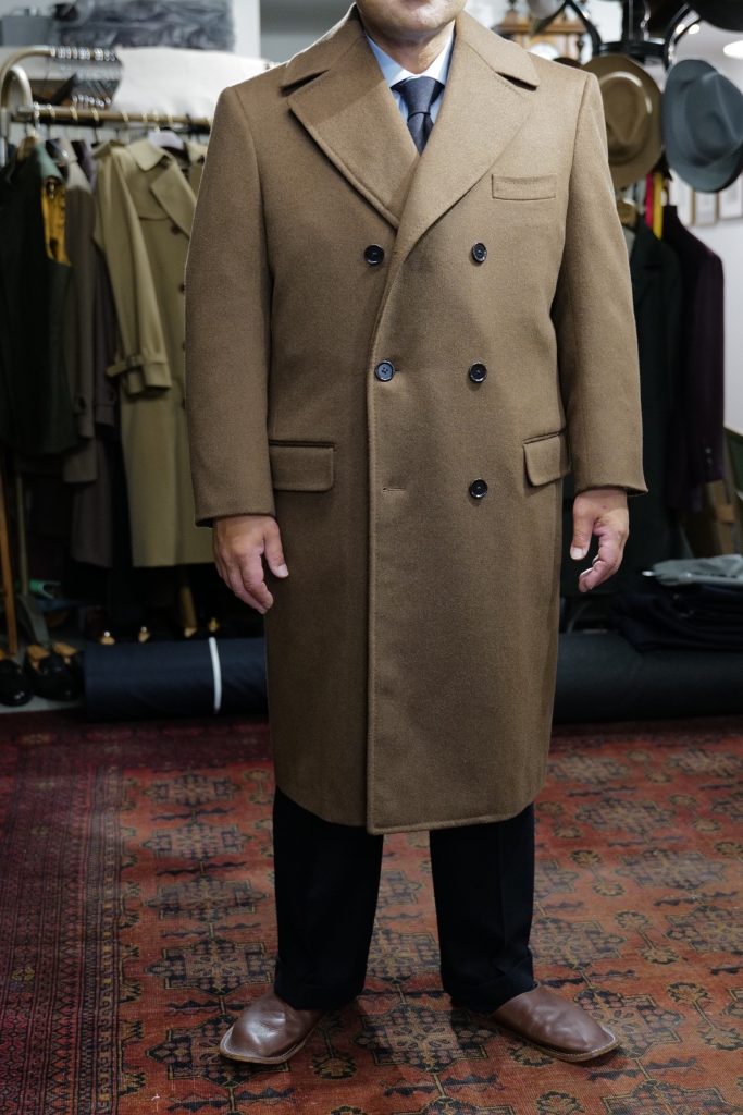 合わせてお仕立ていたしましたのは、モカブラウンのカシミヤウールのアルスターコート。