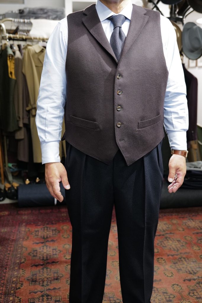 ​合わせたトラウザーズはダークネイビーのフランネル。オッドベストは、1着分だけ残っていたヴィンテージの国産カシミヤ生地を使用しました。赤みがかった綺麗なブラウンで、元々はコート用に買い付けた生地でしたが、ベストとしても非常に良い仕上がりになりました。