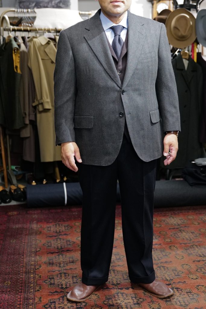 ​初めてお越しいただきましたT様。今回は初めの1着ということで、シンプルなネイビージャケットとグレートラウザーズのコーディネートをお作りいたしました。オッドベストもご依頼いただきましたので、一緒に選ばせていただきました。