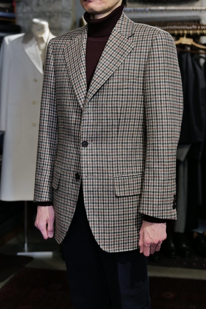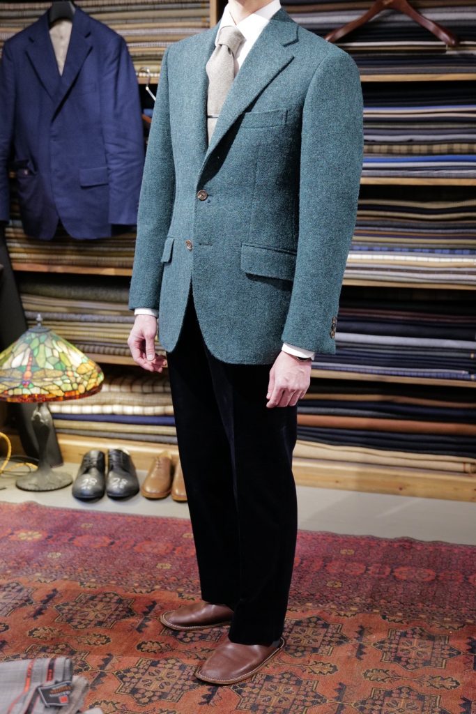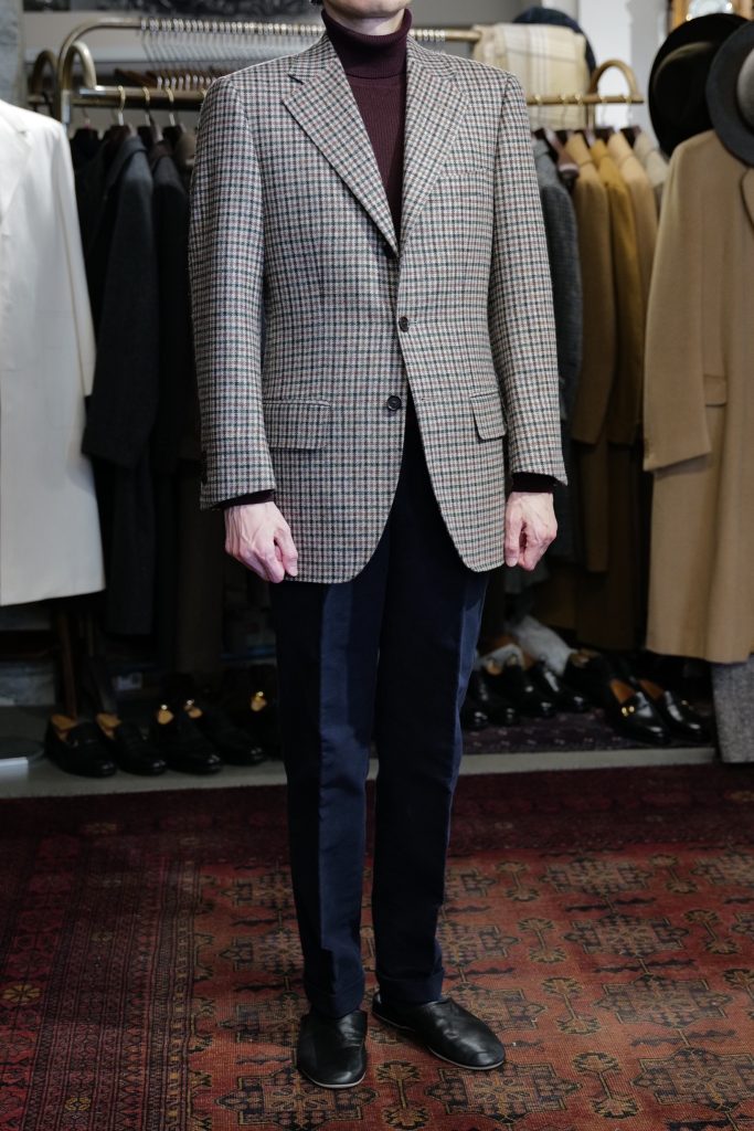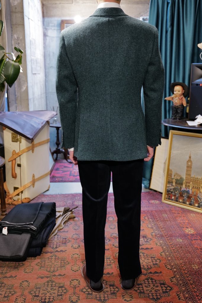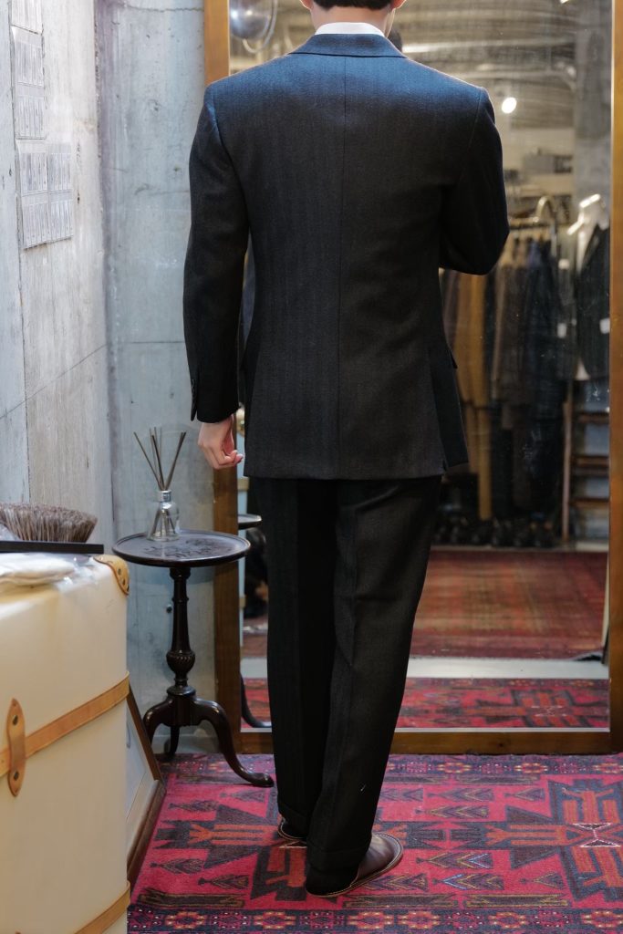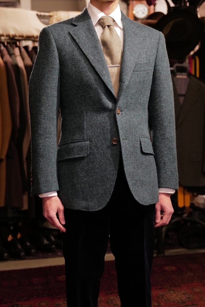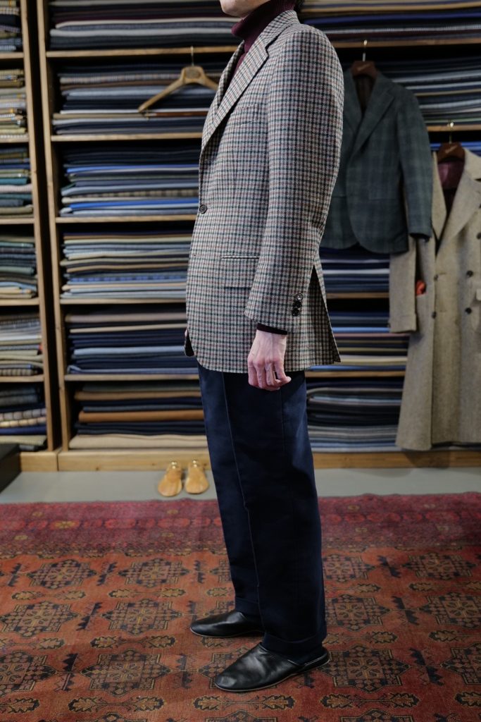 T様にお仕立てしたのは、シングル幅のヴィンテージのハードのジャケットと、ネイビーのオールスキンのトラウザーズ。