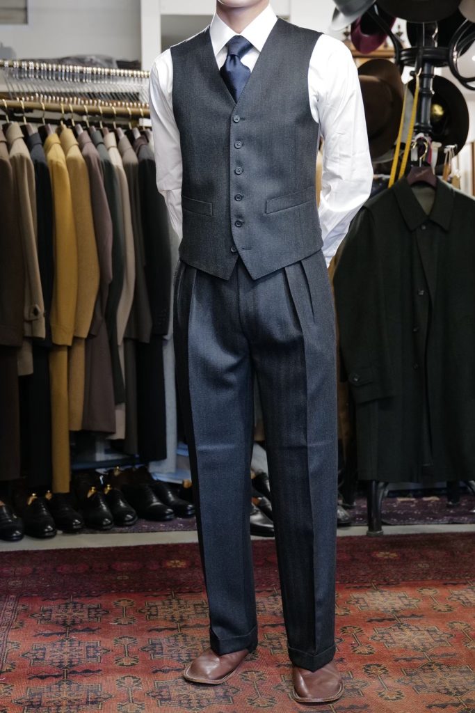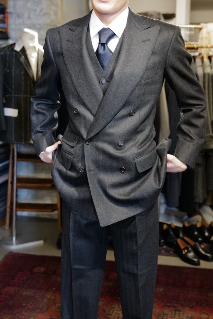 ご提案したのは、ドーメルのチャコールグレーヘリンボーンのフランネルスーツ。